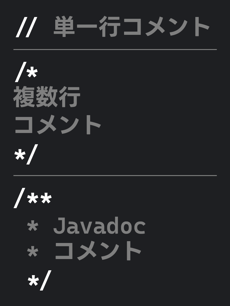 Javadocコメントは主にAPI開発者が使うものなので、日常的に使うのは単一行・複数行コメントです。